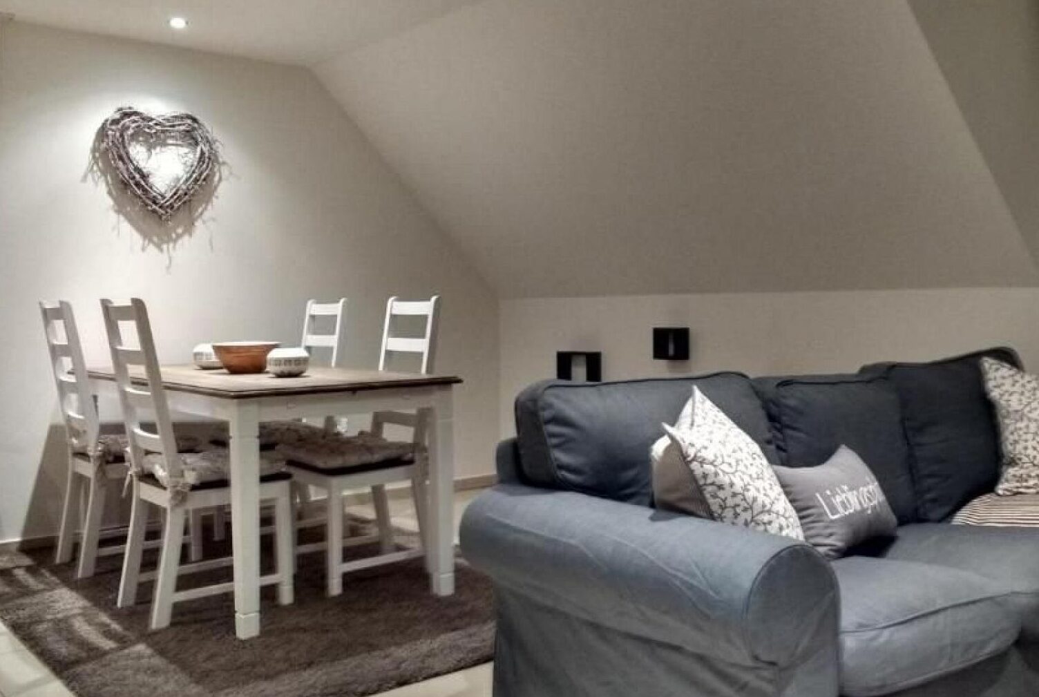 60m² 3 Zimmer Nichtraucher Ferienwohnung für 2-4 Personen, Wohnzimmer, 2 Schlafzimmer mit Doppelbett, Esstisch & Stühle, Küchenzeile, großes Badezimmer mit Eckbadewanne & Dusche, Parkplatz, 1. Etage (Dachgeschoss), Balkon, WLAN, Flachbild-TV, Parkplatz, nicht behindertengerecht.
