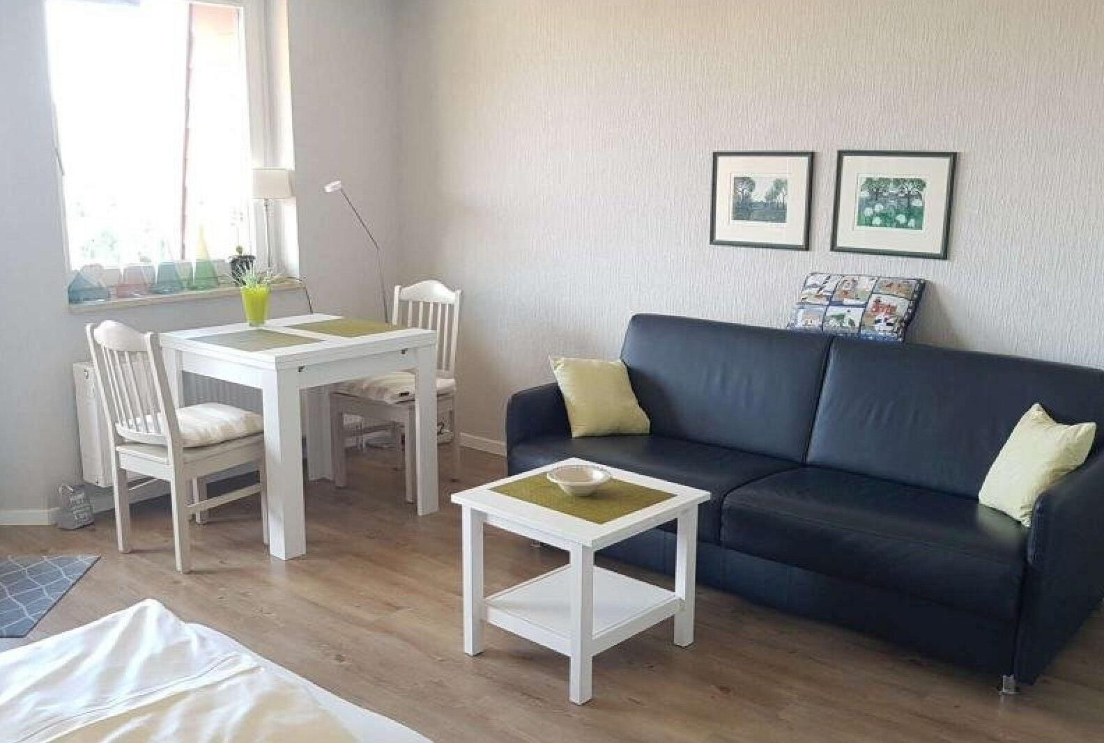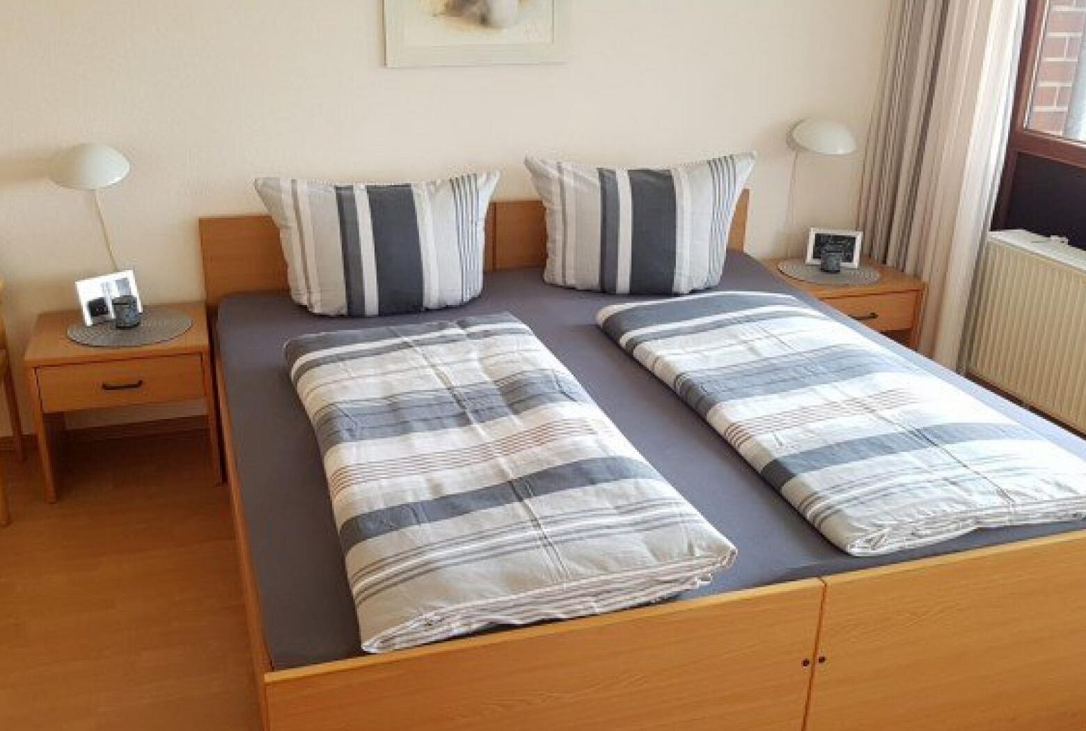 60m² 3 Zimmer Nichtraucher Ferienwohnung für bis zu 4 Personen (2E+2K), Wohnzimmer & Esszimmer, 2 Schlafzimmer (1 Doppelbett, 2 Einzelbetten), Küche, Spülmaschine, Duschbad (36cm Duscheinstiegshöhe), 2. Etage, WLAN, keine Haustiere erlaubt, nicht behindertengerecht. (Letzte Renovierung: 2019)