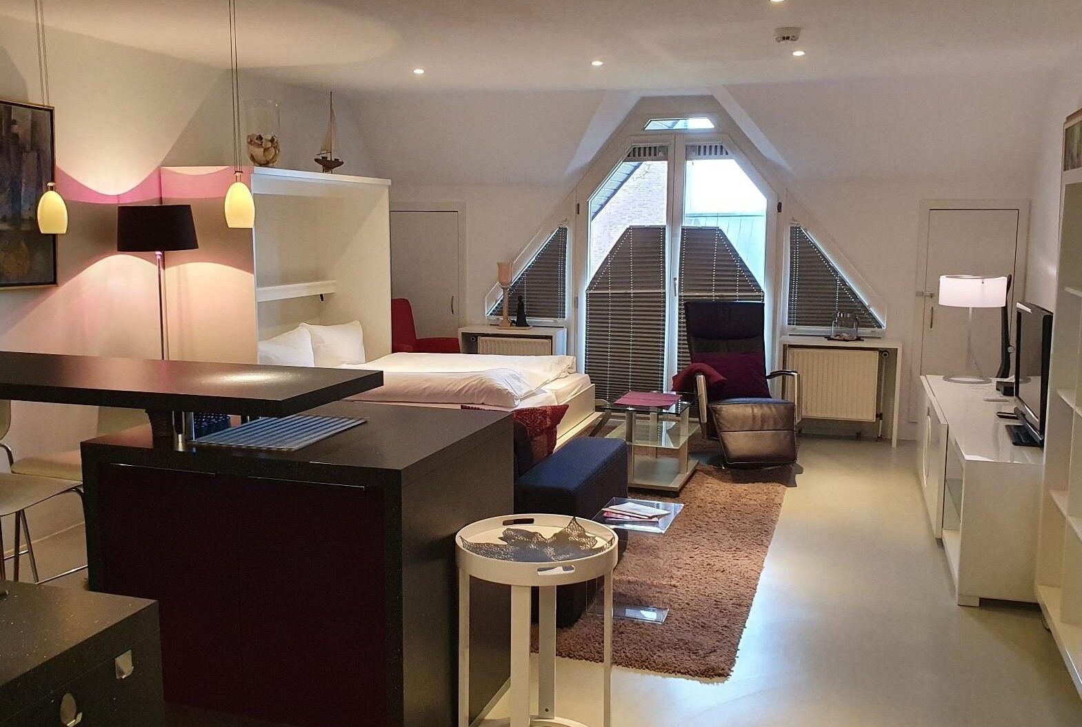 47m² 1 Zimmer Nichtraucher Apartment für 1-2 Personen, Wohn-und Schlafzimmer mit Doppelbett, überdachter Balkon, Küchenzeile, Duschbad (13cm Duscheinstiegshöhe), Parkplatz, Erdgeschoss, WLAN, Bluetooth Box, Schwimmbad, Sauna, , Dachterrasse 4. Etage, keine Haustiere erlaubt, nicht behindertengerecht.